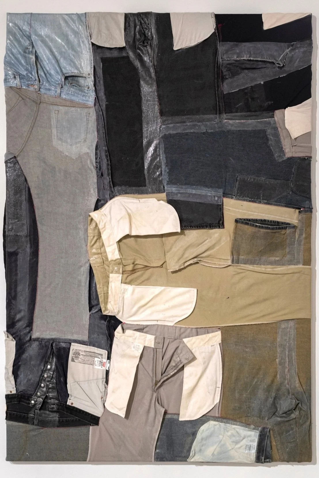 Médiums acrílicos sobre pantalones de trabajador desechados, cosidos a mano, 72’’x48’’, foto por Gustavo Solórzano, cortesía del artista